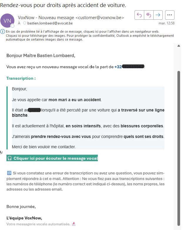 3. VoxNow transcrit ce message vocal et vous le communique par mail.